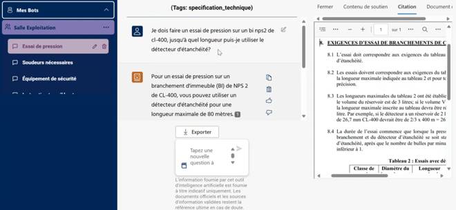 Si le déploiement technologique s’est effectué rapidement, l’harmonisation de la qualité des données et l’appropriation par les personnes utilisatrices ont demandé davantage de temps. Un système de rétroaction simple, basé sur une validation par « pouce en l’air », permet d’évaluer la pertinence des réponses. En cas d’insatisfaction, un tableau de bord identifie les causes possibles, la documentation incomplète, la mauvaise interprétation par l’agent, ou la confusion terminologique, afin de guider les actions correctives. Étant donné le niveau de risque élevé dans certaines interventions, le document de référence est systématiquement cité et facilement accessible.